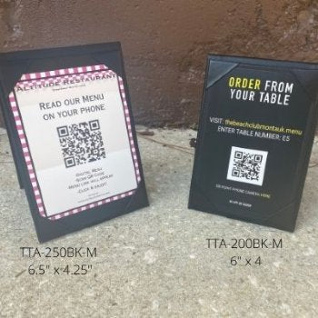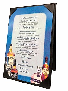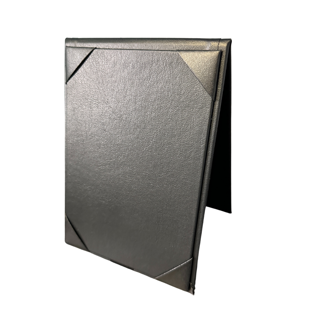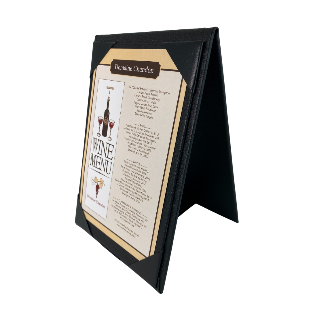 Leatherette A-Frame Table Tents, standard available color is black. The cover and panel cover materials are hi-strength imitation leather that cleans easily with a damp cloth. Woven-edge, satin-finish ribbon corners in a complementary color hold your printed inserts in place. A matching ribbon strap holds the cover open at the base. Board is unpadded. Call for pricing over 300 pieces