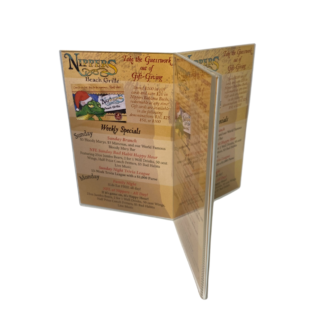 TTN-664 Card Holders clear acrylic table tent, 6" x 4" insert size, 25 per pack. Our 6 view, top-open tabletop stands are made of .080 clear acrylic. These are the quality stands that you've been looking for!