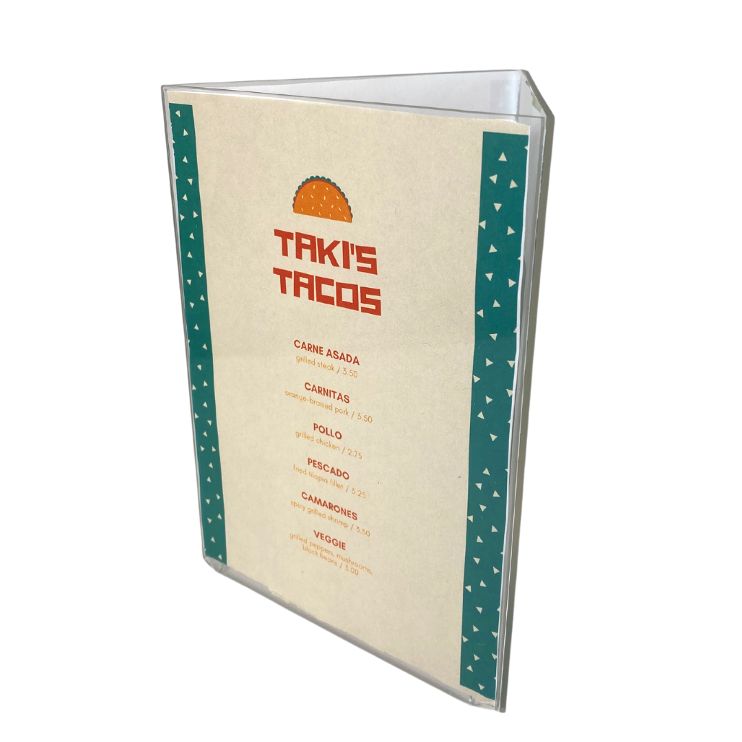 Showcase your menus, promotions, or signage with our sleek clear acrylic three-sided stands. Designed for versatility, these stands allow you to display content on multiple sides, making them perfect for restaurants, retail spaces, offices, and events. Available in a variety of sizes, they offer the flexibility to fit any tabletop or counter space while maintaining a modern, professional look. Durable, lightweight, and easy to clean, these stands are a practical and stylish solution for highlighting important information.