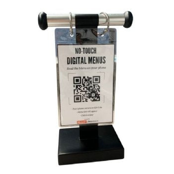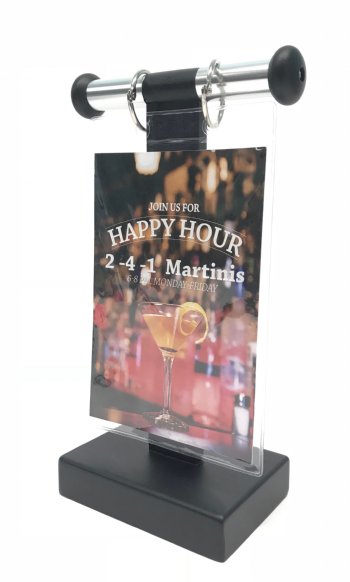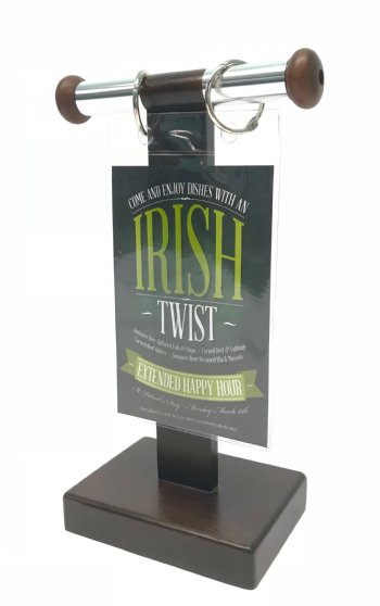 The Menu Designs wooden hanging t-stands are designed to display your announcements, specials, events and more. With the unique design of the stand, this product is ideal for multiple page promotions. This stand is available in Espresso with a nickel bar or in black with a nickel bar. Both stands come with two hanging metal rings